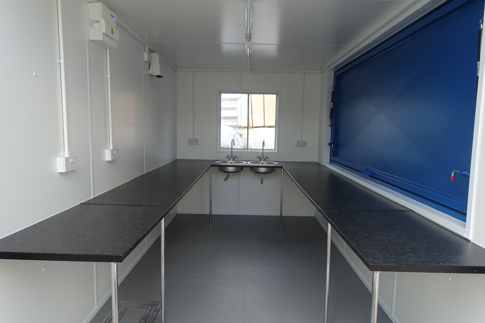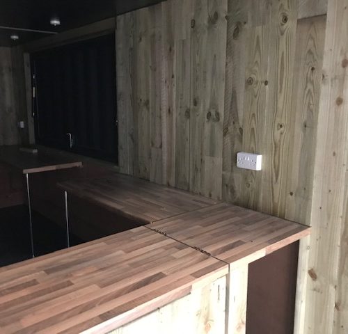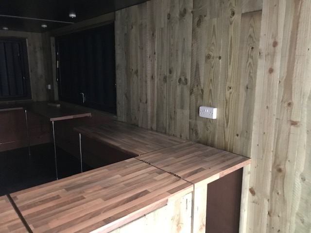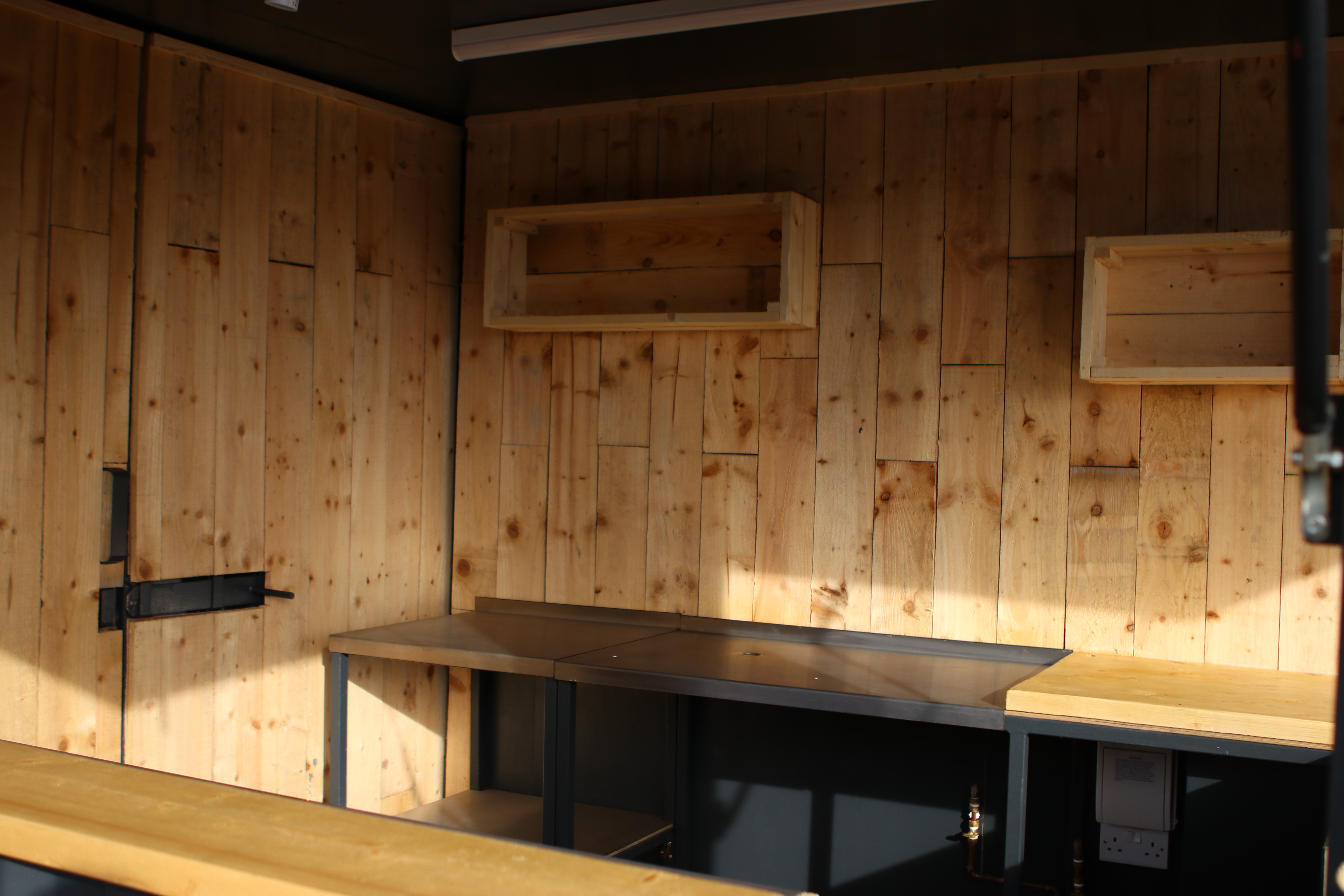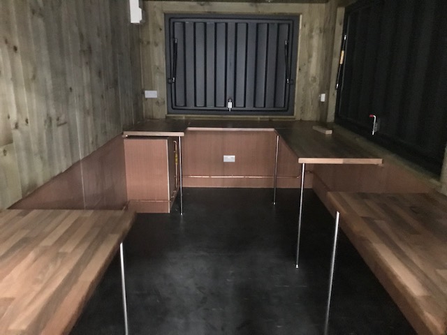 Customisation for catering containers usually varies depending on our client’s requirements, but the standard conversion involves dry lining the container, installing electrics and lighting, internal plumbing for a sink, and the installation of a serving hatch/window.